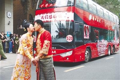 在??陉P(guān)注大巴車當(dāng)婚車的年輕人并不在少數(shù)?!懊恐芪覀兌紩拥阶稍冸娫?,我們會預(yù)留專門車輛運營婚車業(yè)務(wù),有雙層觀光巴士也有常規(guī)大巴?!焙?诮煌都瘓F公交運營分公司運營部工作人員李國安介紹,大巴車作為婚車使用,符合綠色出行的環(huán)保理念。婚車的車身和內(nèi)部可以根據(jù)新人要求進行個性化定制。婚車使用當(dāng)天,公司會安排一名駕駛員和一名管理人員全程陪同,做好相關(guān)后勤保障服務(wù)。