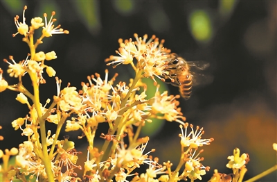 蜜蜂在荔枝花上采蜜。