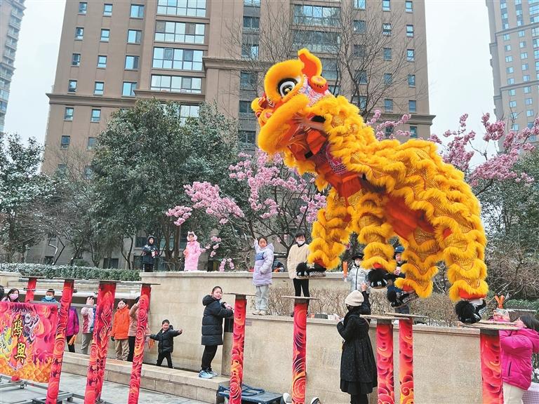 活動現(xiàn)場,社區(qū)和物業(yè)工作人員精心準備百余條燈謎懸掛在燈籠下,一排排紅彤彤的燈籠鮮艷喜慶。社區(qū)文藝志愿者團隊的隊員們身著鮮艷的服裝,隨著喜慶悅耳的鼓點,帶動現(xiàn)場居民一同起舞,社區(qū)廣場上一派熱鬧景象。寓意著風調(diào)雨順、吉祥如意的舞獅表演將現(xiàn)場氣氛推上新的高潮。伴隨著激動人心的鑼鼓聲,兩只“雄獅”或騰空盤旋或左右翻滾,神龍擺尾等姿態(tài)被演繹得淋漓盡致。