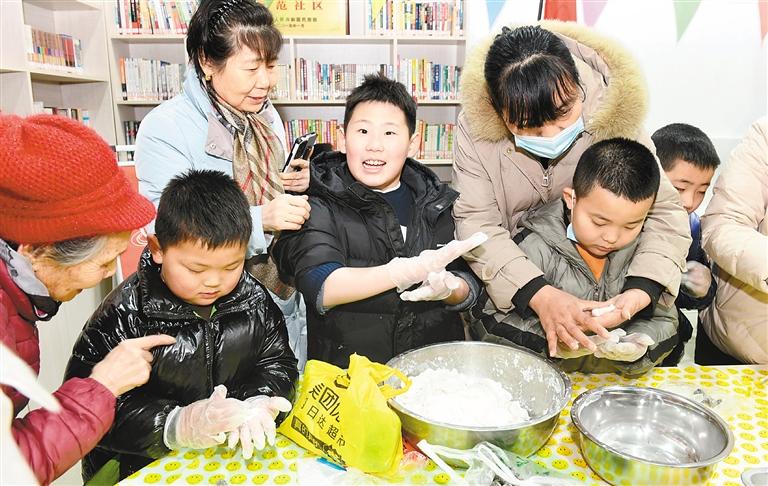 2月22日,韓森寨街道咸東社區(qū)組織轄區(qū)居民群眾,通過猜燈謎、滾元宵、畫年畫、做游戲等方式,在歡聲笑語中共迎元宵佳節(jié)。圖為工作人員與居民一同制作元宵 記者 雷偉東 攝