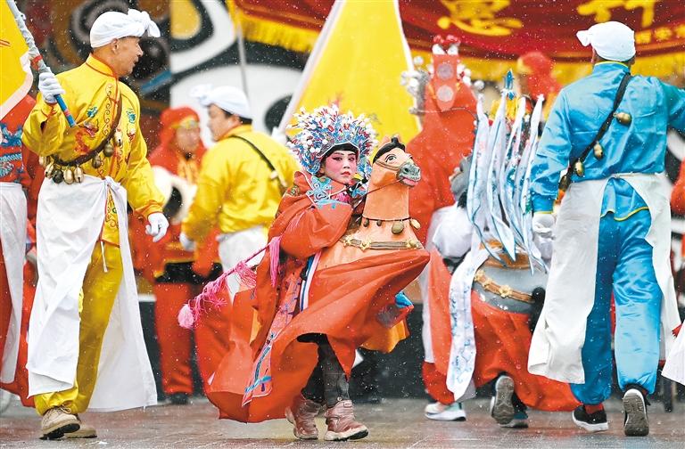 2月22日,在隴州社火過大年活動中,來自高陵區(qū)的社火隊在表演藥惠竹馬。新華社記者 劉瀟 攝