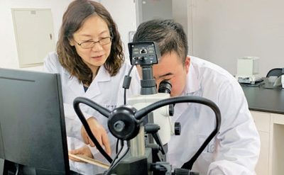 馬曉燕(左)指導(dǎo)學(xué)生分析年輪寬度。記者 施芳 攝