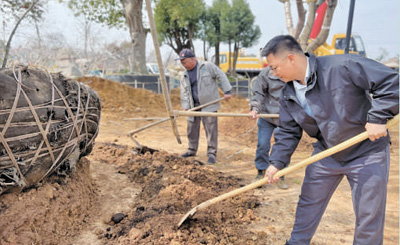 基地內(nèi)同樣熱鬧,挖掘機吊起楓樹樹苗,穩(wěn)穩(wěn)地放入提前挖好的樹坑中。程偉達(dá)帶領(lǐng)苗木工人,扶苗、培土、踩實、澆水……