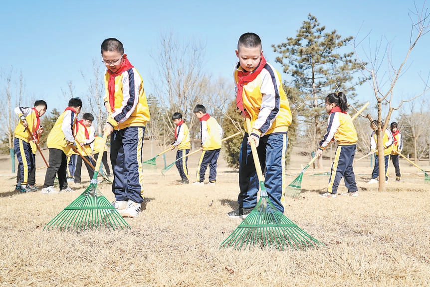 3月12日上午,“運(yùn)河小林長3·12綠地大掃除”在城市綠心森林公園舉行。北京第二實(shí)驗(yàn)小學(xué)通州分校的學(xué)生們學(xué)習(xí)義務(wù)植樹知識,并進(jìn)行現(xiàn)場撫育管護(hù)活動(dòng)。記者 白繼開 攝