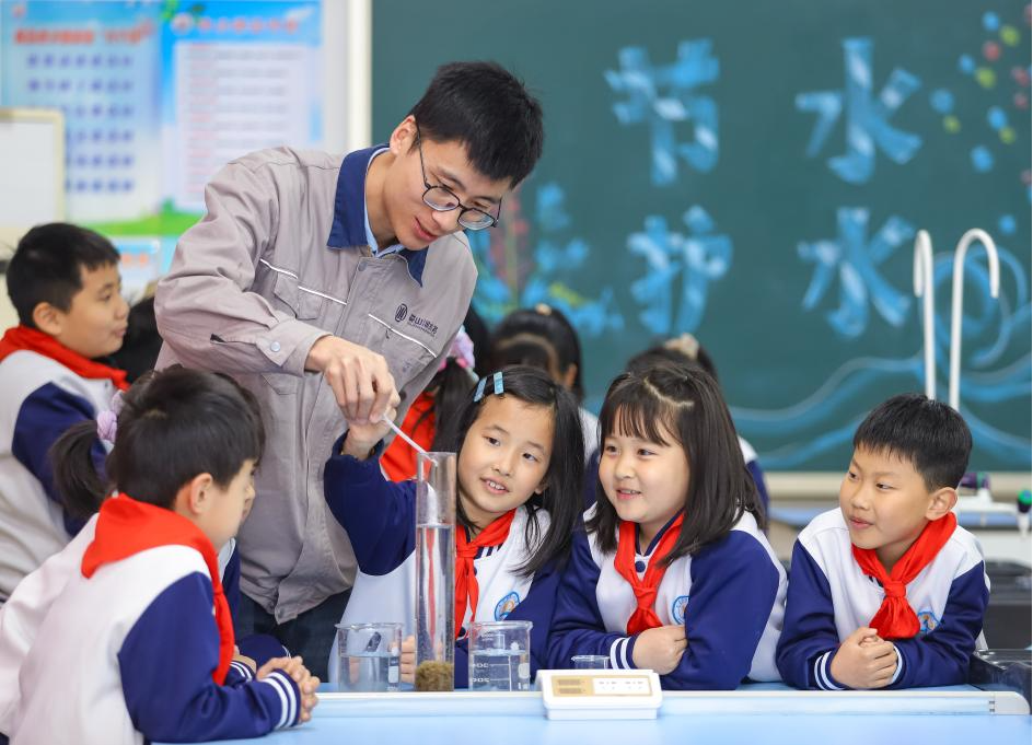 3月21日,在山東青島弘德小學(xué),污水處理廠講解員指導(dǎo)學(xué)生做實(shí)驗(yàn)。