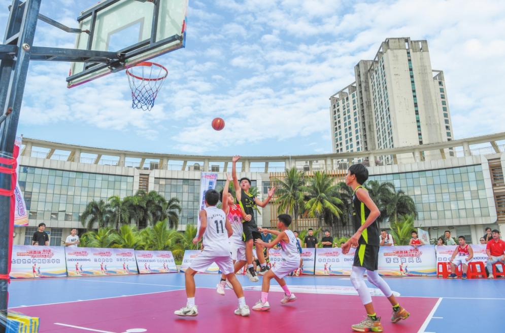 2023年10月29日,第四屆“椰青杯”青少年籃球比賽現(xiàn)場(chǎng),參賽小隊(duì)員正在激烈地進(jìn)行比賽對(duì)抗。