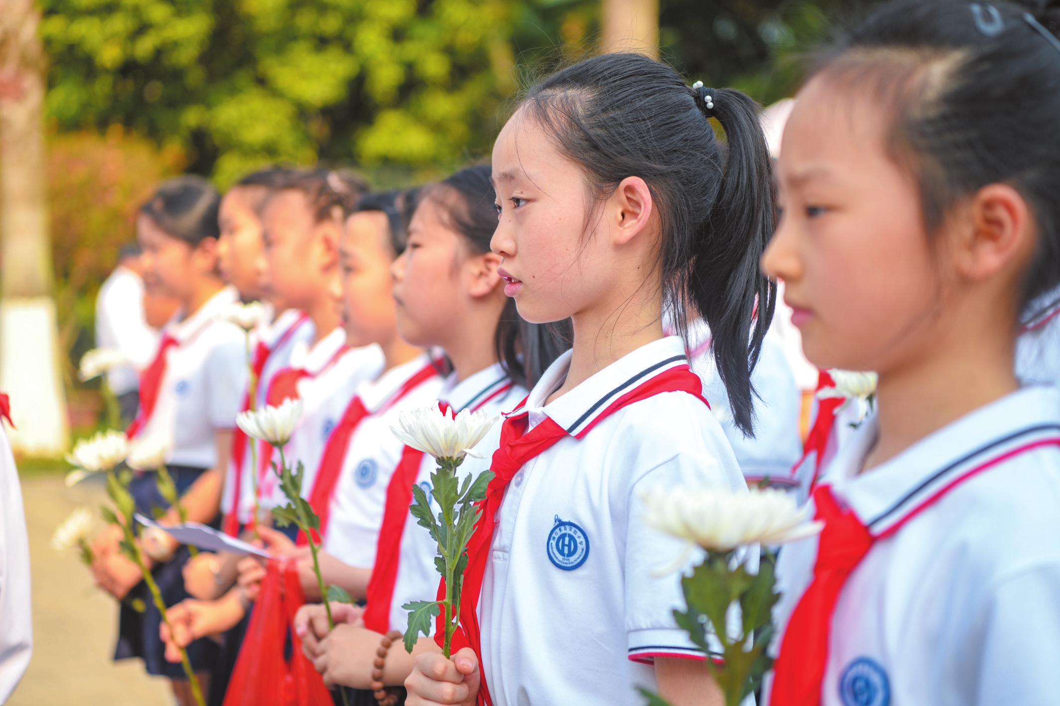 學(xué)生在人民公園“海南革命烈士紀(jì)念碑”前手持鮮花緬懷英烈。記者 蘇弼坤 攝
