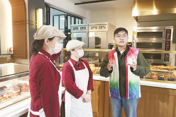 邱力為面包店員工答疑 記者 劉歆 攝