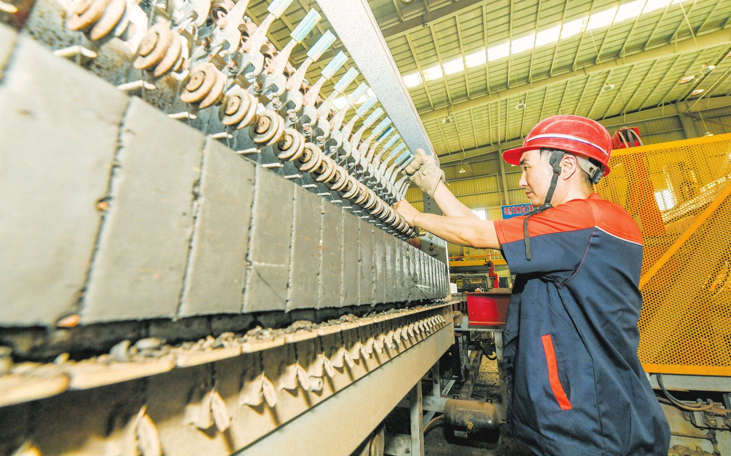 4月17日,工作人員在磚坯自動(dòng)切割機(jī)流水線上忙碌著。記者 康登淋 攝