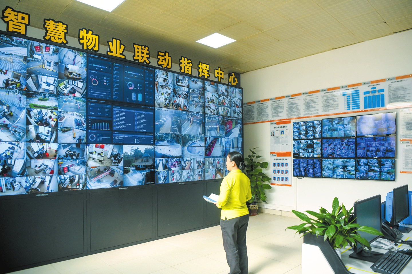 在??谒募救A庭小區(qū),工作人員在智慧物業(yè)聯(lián)動指揮中心觀看小區(qū)內(nèi)情況。記者 楊鶴 攝