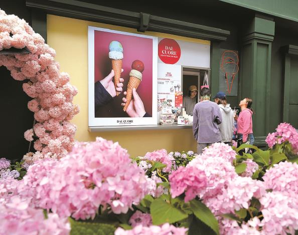 “早在裝修階段,公司就想好了,要在臨街墻面開個洞,引入網(wǎng)紅冰淇淋快閃店,店外布置成外擺位。到時候吃個冰淇淋,再進店看看試試衣服,順理成章。”不出所料,年輕人排隊買好網(wǎng)紅冰淇淋留影,然后坐進開滿繡球花的外擺位,成為大學路上的一道風景線,而這些消費者有不少都會走進店里看看?!白罡叻宓臅r候,一天有6000人進店?!?/p>