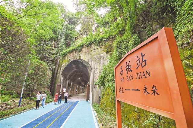 該文化公園由原襄渝鐵路石板隧道廢舊遺址打造而成,包括童趣互動、文化驛站和運動健身3個主題區(qū)域。隧道內(nèi)有鐵路主題浮雕、復古式候車站臺、綠郵箱等舊時光特色文化打卡點,一路向前,有沙池、秋千等兒童游樂設施。公園另一端,是五人制足球場、乒乓球場、羽毛球場等。