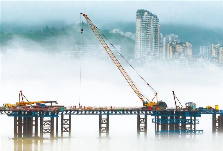7月12日,重慶市開州區(qū)漢豐湖云霧繚繞,工人正在修建濱湖棧道。近年來,開州區(qū)持續(xù)優(yōu)化環(huán)湖城區(qū)配套設(shè)施,加快推進濱湖棧道、步道等景觀建設(shè),滿足市民休閑需求、改善人居環(huán)境、提升城市品質(zhì)。王曉宇 攝(中經(jīng)視覺)