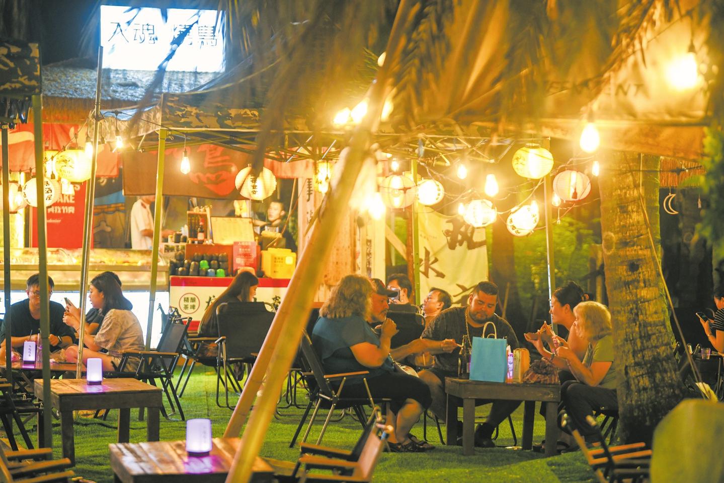 7月18日,市民游客相約來到海甸溪北岸西溪里商業(yè)街,在夜色下大快朵頤。記者 楊鶴 攝