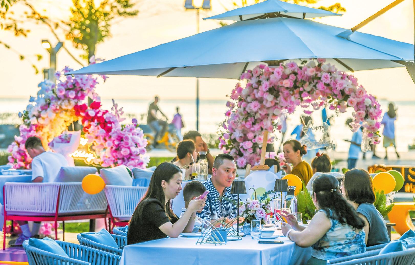 近日,走進位于龍華區(qū)的??贔UNBAY自在灣商業(yè)街區(qū),記者看到已有不少品牌入駐。據(jù)介紹,該街區(qū)計劃于年內(nèi)正式開街,規(guī)劃有包括餐飲、娛樂、復合零售等在內(nèi)的多個業(yè)態(tài)。在IS PARTY嶼海之約餐廳酒吧,露天區(qū)域被鮮艷的花束裝點得十分浪漫,食客們在其中傾聽音樂、享用美食。“我們看中??跒车膮^(qū)位優(yōu)勢,希望通過提供濱海消費場景,為??谠鎏砘盍Ω泻蜁r尚感?!痹摬蛷d酒吧店長王李平介紹。