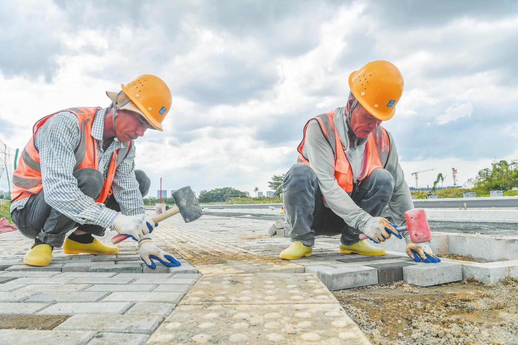 近日,在江東新區(qū)府越路項目西段,施工人員正在鋪設地磚。記者 孫士杰 攝