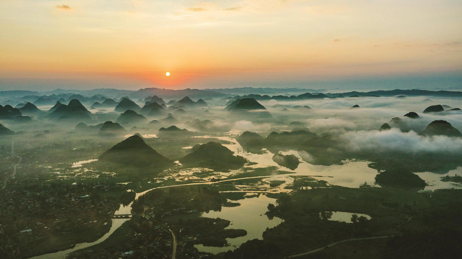 10月7日,云霧繚繞中的云南省文山壯族苗族自治州丘北縣普者黑喀斯特國家濕地公園(無人機(jī)照片)。