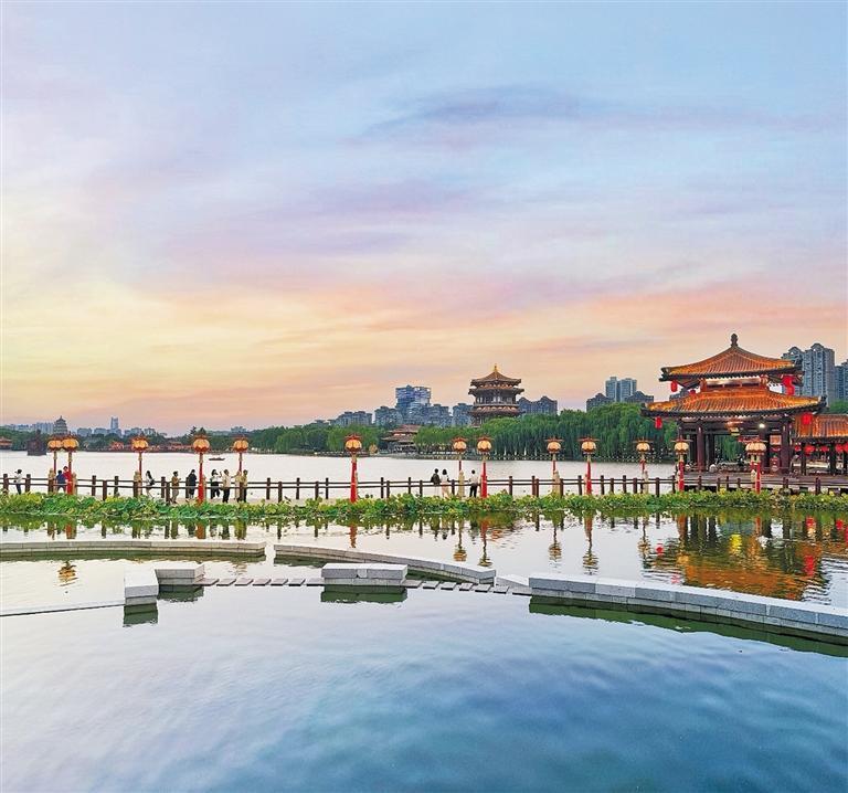 近年來,西安曲江池·大唐芙蓉園水利風(fēng)景區(qū)貫徹落實(shí)河湖長制,構(gòu)建完善管理體系,有效提升河湖管理效率與動態(tài)監(jiān)管能力,同時注重水資源集約利用,水環(huán)境保護(hù)治理取得顯著成效?!拔姨貏e喜歡這里的文化氛圍。水舞光影秀《大唐追夢》太震撼了!站在湖邊,濃郁的盛唐文化氣息撲面而來,令人心曠神怡?!眮碜陨虾5挠慰蛥翘煊畋硎?,這樣的體驗(yàn)讓他更加喜歡西安。