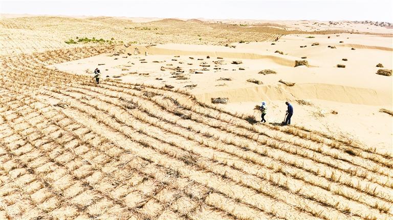 工人在騰格里沙漠扎制被譽為“治沙魔方”的麥草方格。