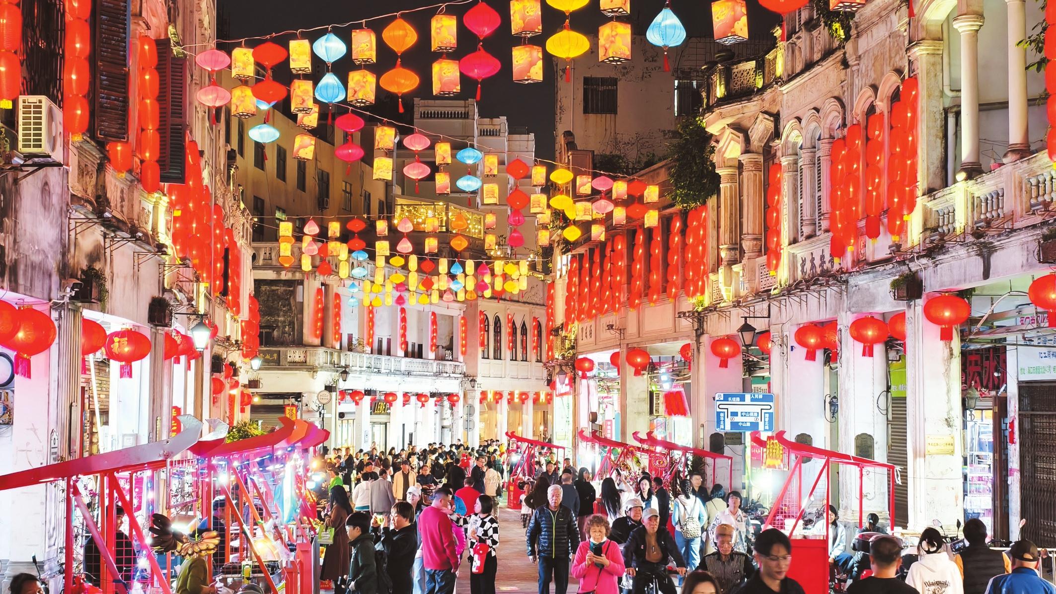 1月4日晚,隨著夜幕降臨,??隍T樓老街上一盞盞燈籠被點(diǎn)亮,映照在古老建筑上,光影交織,如夢(mèng)如幻。市民游客穿梭其中,歡聲笑語不斷,讓老街煥發(fā)出獨(dú)特魅力。 記者 康登淋 攝
