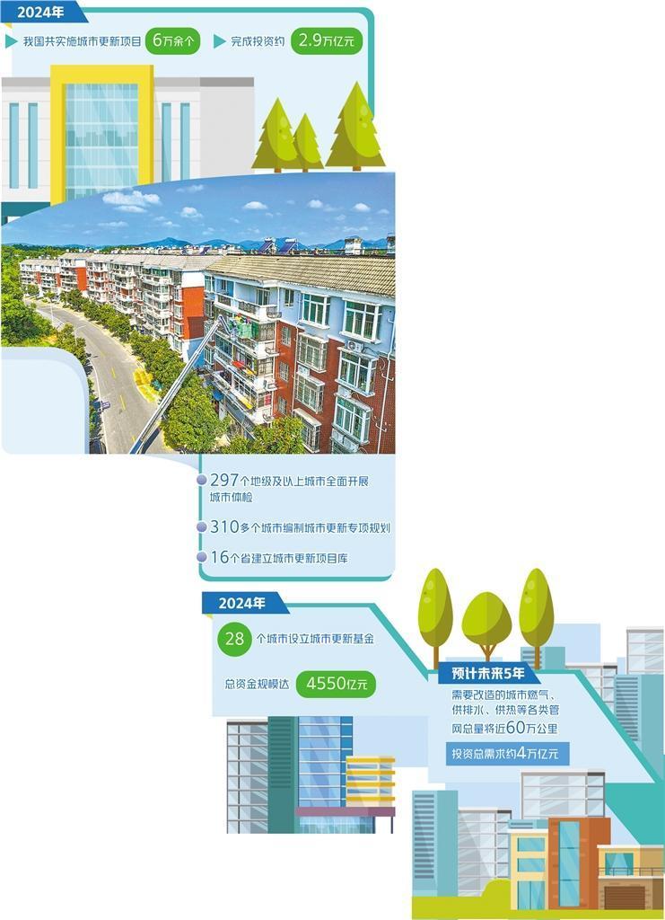 將優(yōu)先支持一批城市更新重點(diǎn)項(xiàng)目。劉蘇社表示,2023年至2024年,國(guó)家發(fā)展改革委安排中央預(yù)算內(nèi)投資、增發(fā)國(guó)債資金和超長(zhǎng)期特別國(guó)債資金共超過(guò)4700億元,其中重點(diǎn)支持了城市燃?xì)?、排水等地下管網(wǎng)改造和城鎮(zhèn)老舊小區(qū)改造等城市更新項(xiàng)目。今后幾年,城市更新仍是政府投資的重點(diǎn),2025年也將繼續(xù)加大力度。