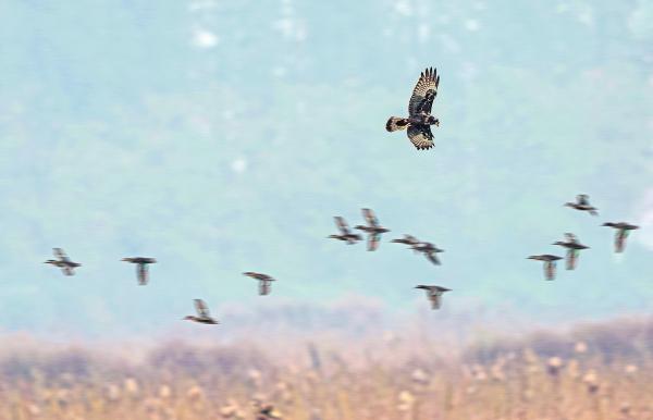 2024年12月15日,岳陽(yáng)市屈原管理區(qū)營(yíng)田鎮(zhèn),國(guó)家二級(jí)保護(hù)動(dòng)物白腹鷂在空中巡視,一群綠翅鴨從它腳下快速飛過(guò)。