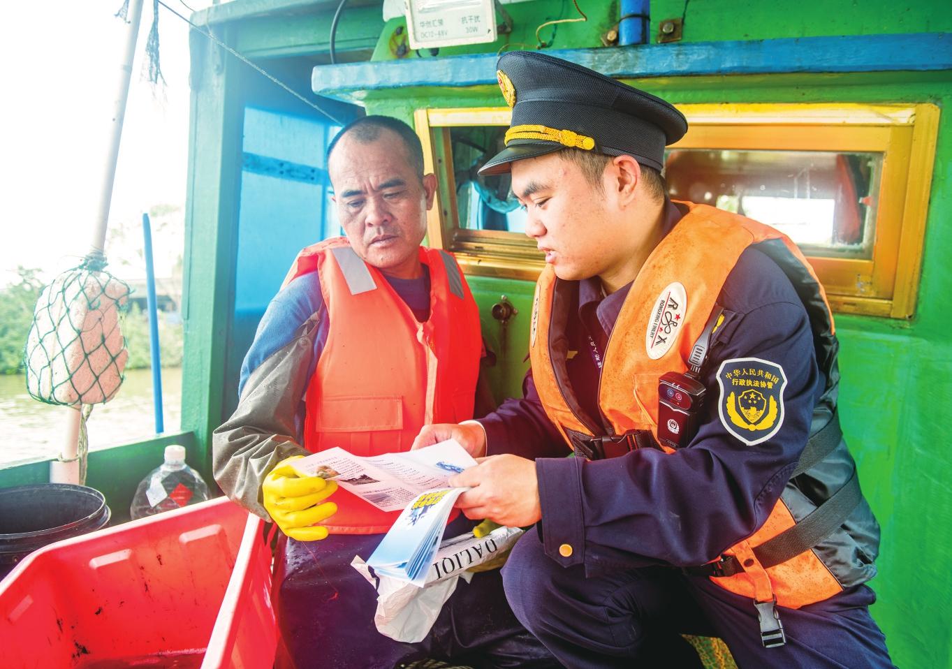 陸路組由第一大隊大隊長廖國祥帶隊前往南渡江畔的村莊和碼頭,執(zhí)法人員在顯著位置張貼宣傳標語,并向過往村民發(fā)放禁漁宣傳單,講解相關政策。