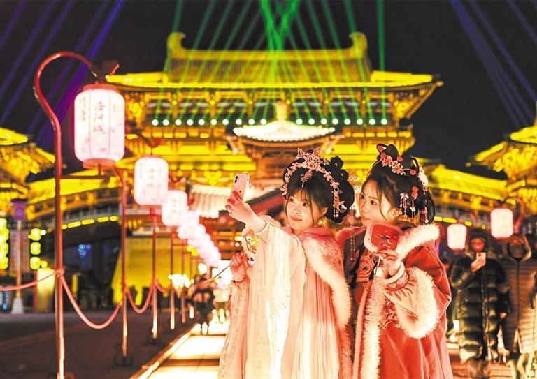 2月12日,身著漢服的游客在河南省洛陽市隋唐洛陽城九洲池神都上元燈會游園賞燈。張光輝 攝(中經(jīng)視覺)