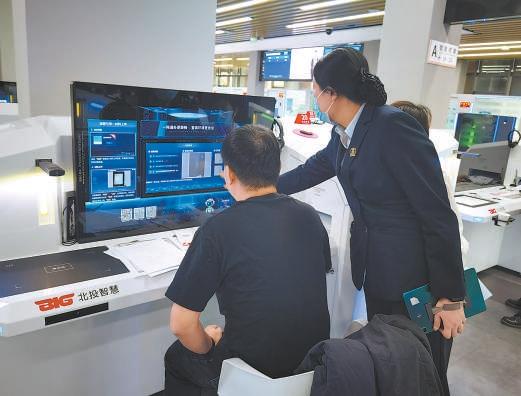 這座大廳開放運(yùn)行后,北京東部地區(qū)的群眾辦理市級事項(xiàng),不必再橫穿城市趕往六里橋政務(wù)服務(wù)中心了。辦事人在大廳入口取號后,會得到一個印有二維碼的紙條。憑身份證或二維碼,可以打開智能自助終端。智能終端類似一臺裝著屏幕的電腦桌,桌面上除了鍵盤、USB插口、耳機(jī)插口,還有呼叫人工服務(wù)的按鈕、無線充電圈……可以辦理市區(qū)兩級3000余項(xiàng)業(yè)務(wù)。