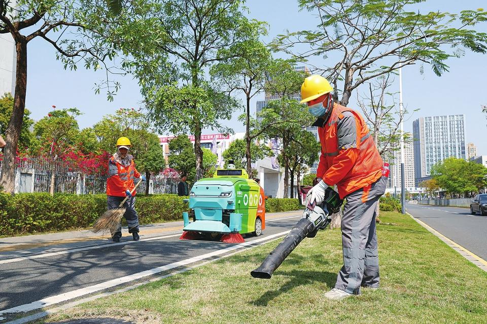 3月19日,在深圳市坪山區(qū)石井街道,環(huán)衛(wèi)機(jī)器人與環(huán)衛(wèi)工人進(jìn)行協(xié)同作業(yè)。在深圳市坪山區(qū)石井和坑梓兩個街道,道路上不時能看到彩色的環(huán)衛(wèi)機(jī)器人出沒。它們能夠自主識別垃圾、自動返回基站倒垃圾并加水,與環(huán)衛(wèi)工協(xié)同配合完成復(fù)雜道路清掃工作。(新華社記者 毛思倩攝)