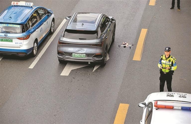 福田大隊機(jī)訓(xùn)中隊副中隊長李海峰告訴記者,無人機(jī)實時對違法行為進(jìn)行抓拍取證,快速準(zhǔn)確定位。路面警力即刻響應(yīng)、快速攔截查處,大幅提升了執(zhí)法效率。即使現(xiàn)場沒有及時攔截住違法車輛,通過無人機(jī)執(zhí)法抓拍的整段視頻也可以完整展現(xiàn)違法過程,后續(xù)進(jìn)行調(diào)查處理?!吧钅洗蟮缹儆诙壪扌袇^(qū),違規(guī)駛?cè)朐撀范蔚模覀円婪ò礇_禁令進(jìn)行處罰并查扣車輛?!崩詈7逭f。