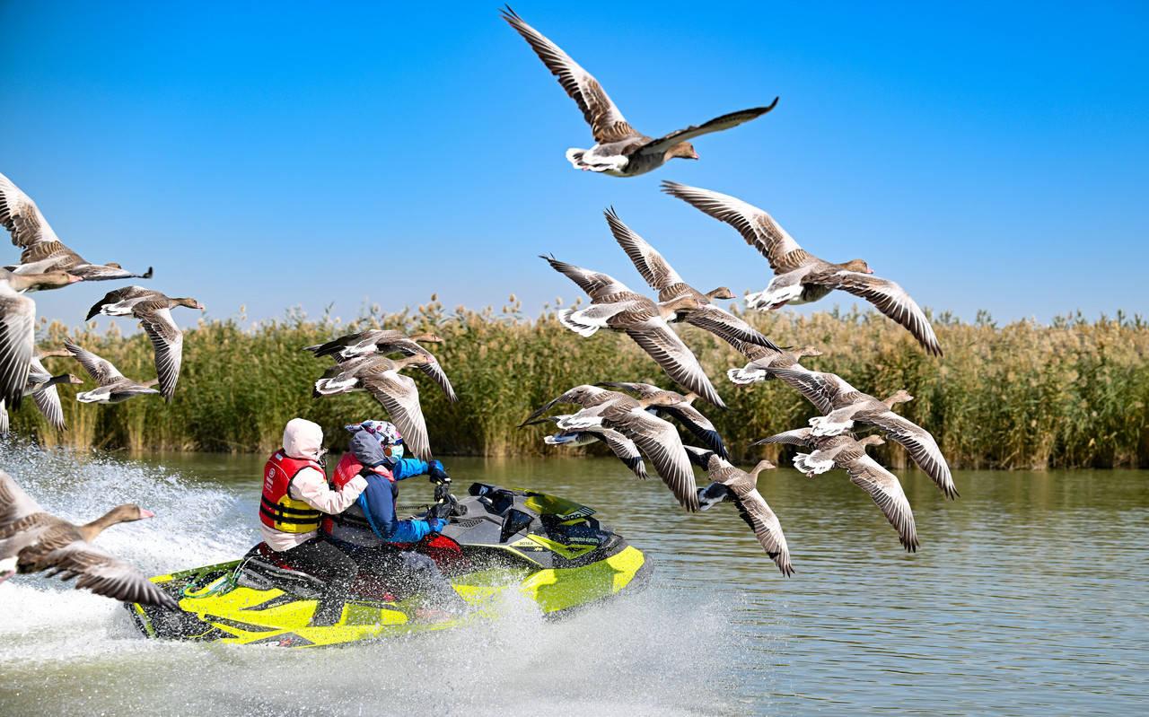游客在沙湖景區(qū)乘坐快艇時(shí)大雁在一旁飛翔。當(dāng)日是國慶假期的第二天,許多游客來到寧夏石嘴山市沙湖景區(qū),感受沙漠與湖泊相依的獨(dú)特景觀。新華社記者 馮開華 攝