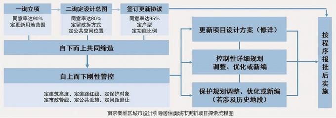 依據(jù)市級(jí)相關(guān)政策文件,結(jié)合項(xiàng)目實(shí)踐,南京秦淮區(qū)探索“自下而上多輪協(xié)商→自上而下規(guī)劃管控→修詳設(shè)計(jì)方案→控詳規(guī)劃優(yōu)化調(diào)整→初步設(shè)計(jì)→施工圖設(shè)計(jì)→建設(shè)實(shí)施→后續(xù)運(yùn)營(yíng)”聯(lián)動(dòng)管理機(jī)制??卦敗⑿拊斠?guī)劃承接協(xié)商意見和管控要求,指導(dǎo)、支撐城市更新實(shí)踐。