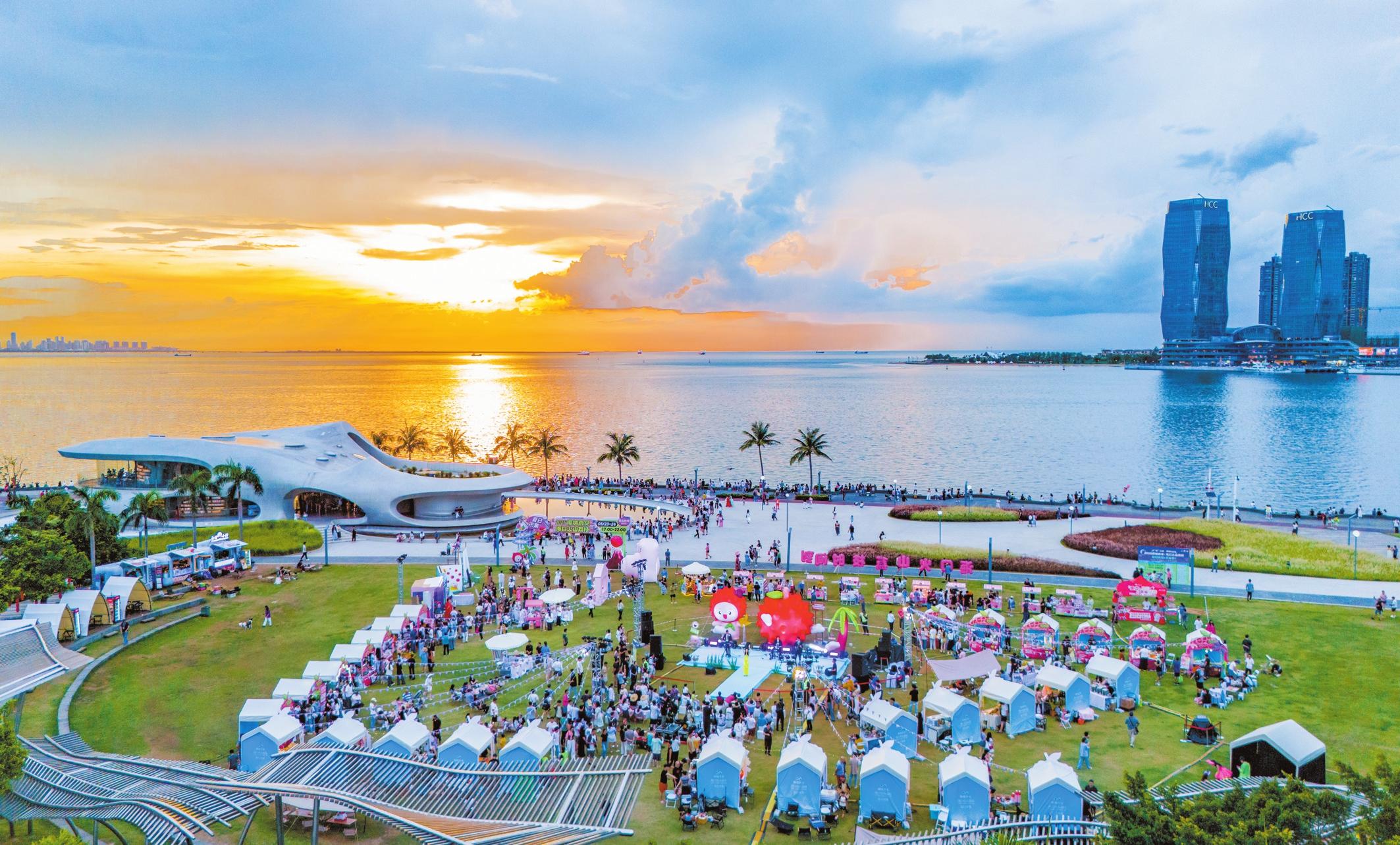 文化浸潤(rùn),以精神豐盈塑造城市品格。華燈初上,世紀(jì)海角文化商業(yè)街區(qū)的霓虹與晚霞交相輝映。手工藝人展示黎錦編織技藝,街頭樂(lè)隊(duì)奏響海南民歌,游客舉著“老爸茶”奶茶打卡拍照——這條2023年開業(yè)的特色街區(qū),已成為??谝菇?jīng)濟(jì)的“流量擔(dān)當(dāng)”。
