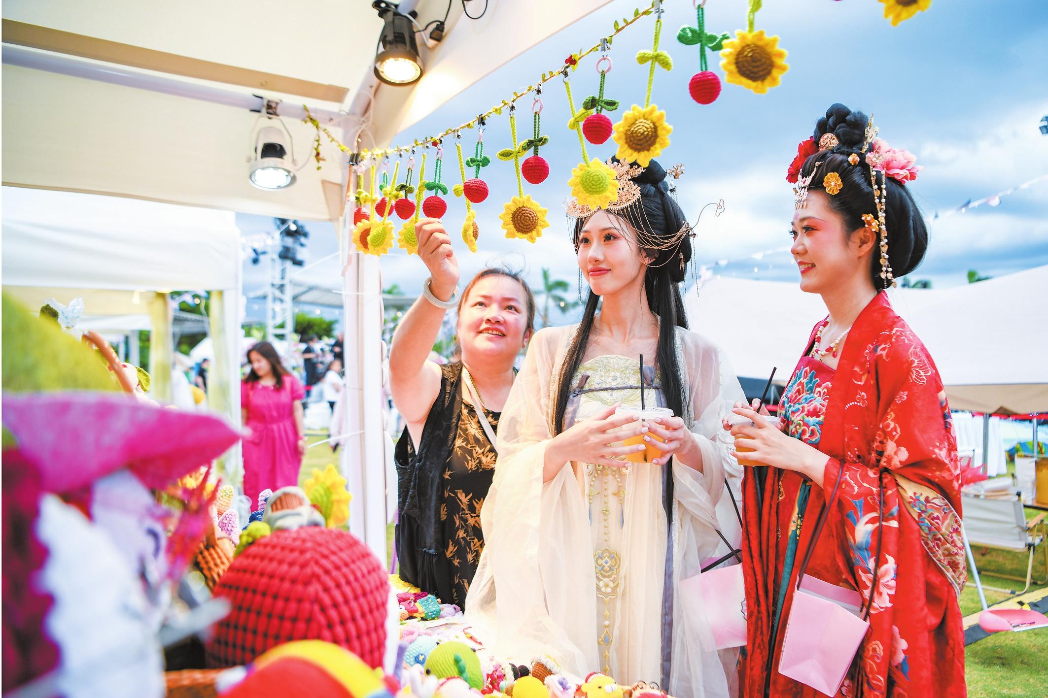 身穿傳統(tǒng)服飾的市民在2025椰城香見·??诨鹕嚼笾ο娜帐屑腺?gòu)物,臉上洋溢著幸福的笑容。記者 蘇弼坤 攝