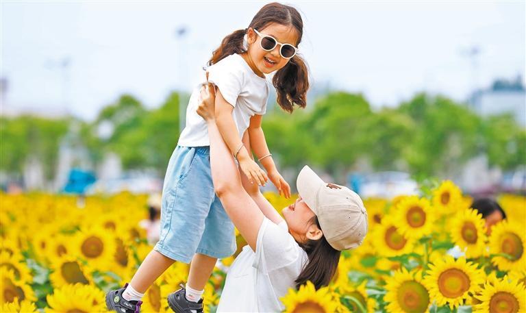 6月7日,游客在安徽省淮北市渠溝鎮(zhèn)張樓村油葵種植基地賞花游玩。李鑫攝(中經(jīng)視覺)