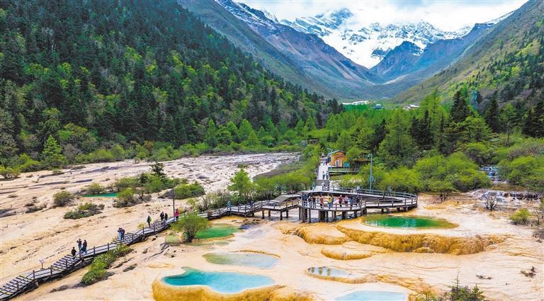 6月10日,四川省阿壩州松潘縣黃龍風(fēng)景區(qū),游客在觀賞鈣華地貌景觀。黃勝林攝(中經(jīng)視覺)