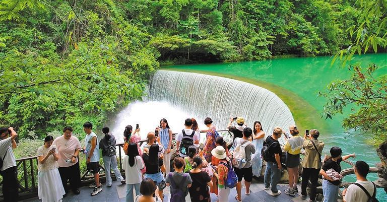 6月10日,貴州省荔波縣小七孔景區(qū)碧波蕩漾,游客在臥龍?zhí)镀俨记芭恼樟裟?。郭興成攝(中經(jīng)視覺)