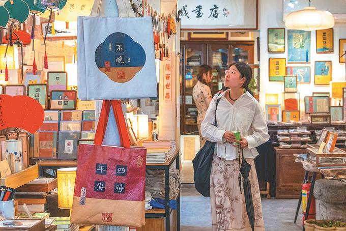 揚(yáng)州皮市街的邊城書店,能買書還能體驗(yàn)古籍修復(fù),古籍拼貼畫、錦灰堆等文創(chuàng)產(chǎn)品更是吸引不少年輕人到此親近傳統(tǒng)文化。劉江瑞 攝 (視覺江蘇網(wǎng)供圖)