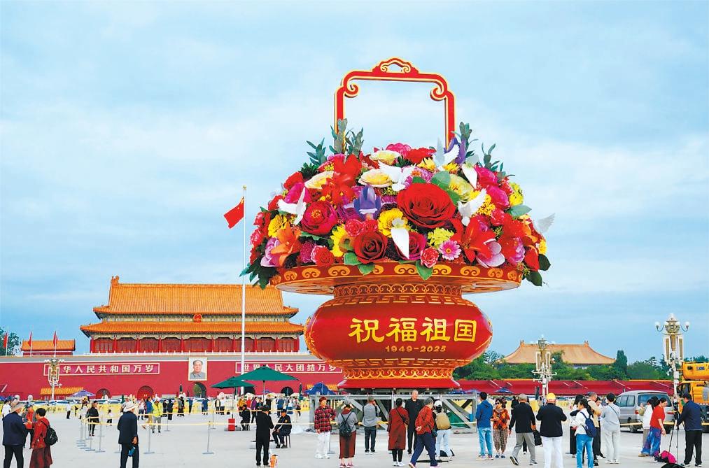 9月22日清晨,天安門廣場中心“祝福祖國”花籃亮相。游客們駐足拍照,流連忘返。美麗的花籃還吸引了很多麻雀在花叢中穿梭嬉戲。 記者 王海欣 攝