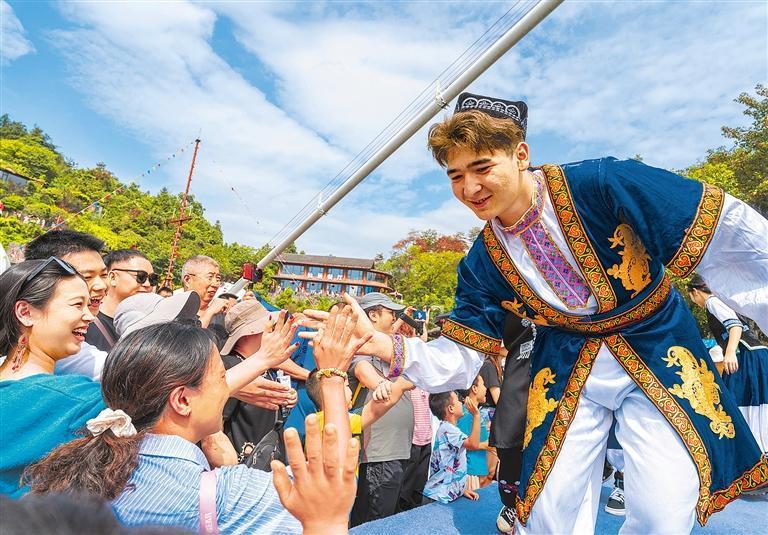 10月3日,湖南省吉首市矮寨大橋景區(qū)上演“56個民族風(fēng)情盛會”,演員與游客互動,現(xiàn)場十分熱鬧。梁永鴻攝(中經(jīng)視覺)