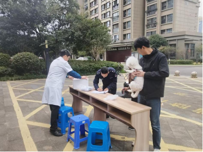 行動中,執(zhí)法隊(duì)在各社區(qū)的物業(yè)中心或公共活動區(qū)域設(shè)立了“一站式”便民服務(wù)點(diǎn)。執(zhí)法人員、社區(qū)工作者及專業(yè)獸醫(yī)團(tuán)隊(duì)分工協(xié)作,現(xiàn)場秩序維護(hù)、信息核驗(yàn)、犬只免疫、芯片植入等環(huán)節(jié)銜接順暢。獸醫(yī)團(tuán)隊(duì)嚴(yán)格規(guī)范免疫與芯片植入流程,確保操作安全精準(zhǔn);執(zhí)法隊(duì)隊(duì)員現(xiàn)場解讀文明養(yǎng)犬法規(guī),解答居民疑問;社區(qū)工作人員同步完成犬主信息、犬只特征、免疫記錄及芯片編碼的“四維”信息采集,確保登記在冊的信息完整、準(zhǔn)確。