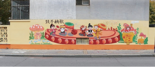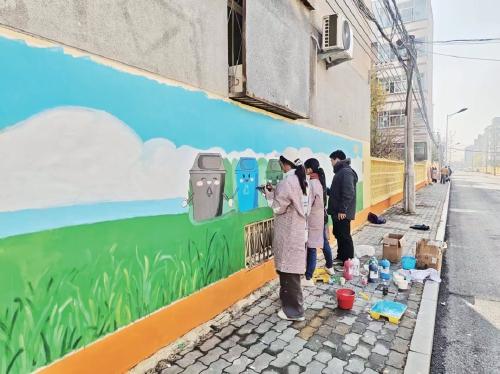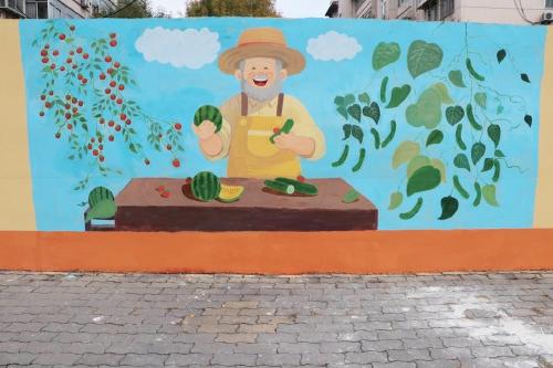 為讓墻繪作品既貼合城市文明建設要求,又貼近民生、便于傳播,雙方多次深度對接:一方面將垃圾分類、街巷環(huán)境提升等城管重點工作轉化為生動畫面,讓市民在觀賞中直觀了解城管工作;另一方面融入濟陽地標、特色農副產品、鼓子秧歌等本土元素,將抽象文明理念與地域文化轉化為場景化視覺內容,增強群眾認同感。