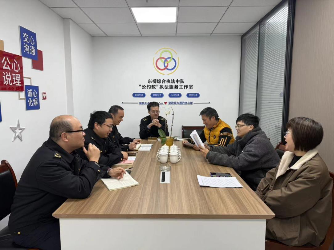 圖為東柳中隊(duì)在“公約數(shù)”執(zhí)法服務(wù)工作室與企業(yè)協(xié)商解決問題