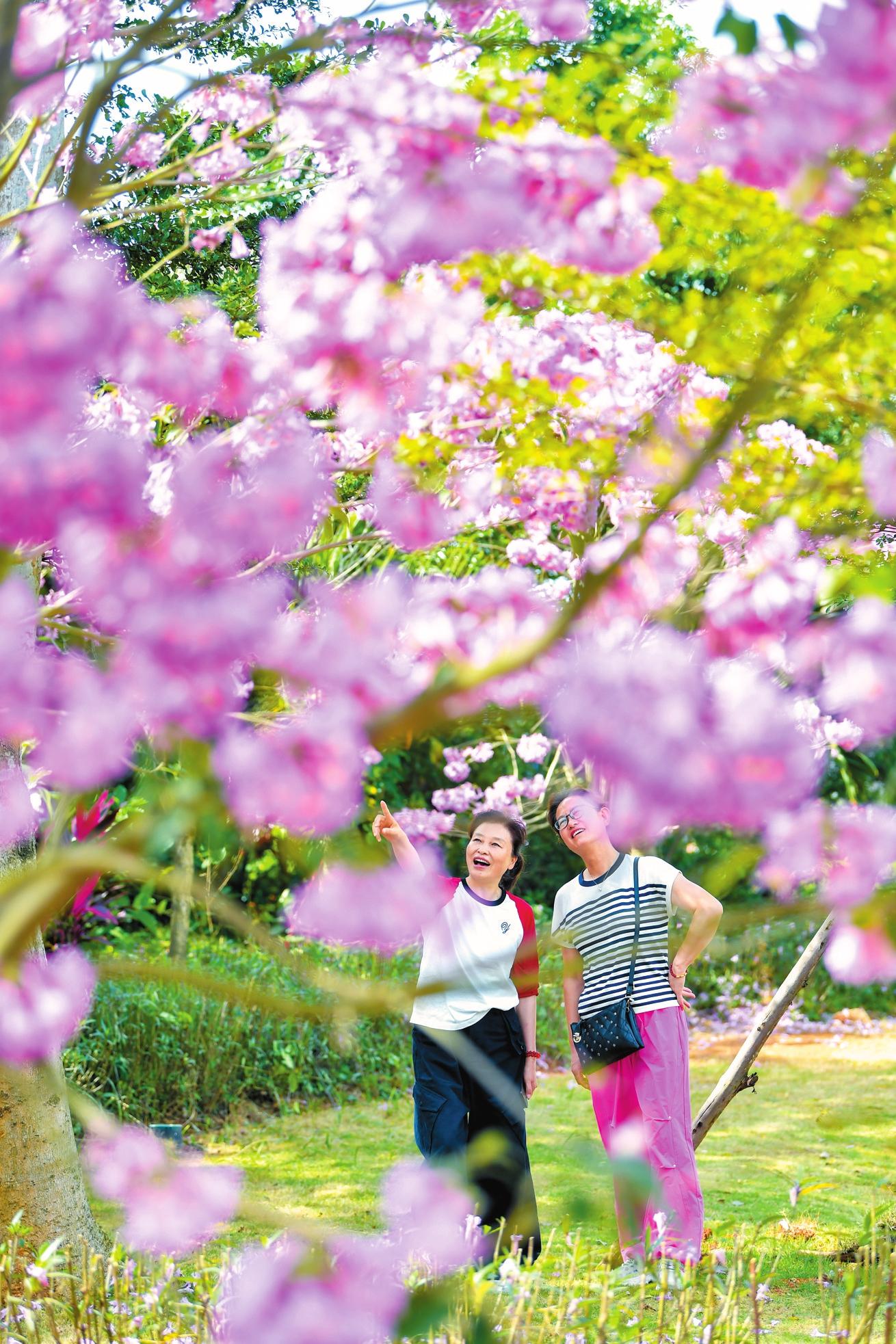 近年來,海口通過栽植各類開花喬木,用繽紛花景勾勒城市美學(xué)輪廓,催生了多個網(wǎng)紅景觀。沿著國興大道前行,一條綿延的花帶在大道兩側(cè)延伸開來。微風(fēng)吹過,花瓣輕輕飄落,散落在茵茵綠草之上,猶如繁星點點,別有情趣,意境動人?!霸酒胀ǖ木G化帶,因為滿樹繁花一下子‘活’了起來,顏色豐富了,整個城市感覺更美了?!笔忻駝⒛扰e著手機,興致勃勃地記錄著眼前美景。