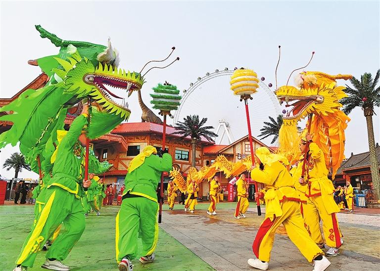 1月1日,一支民間舞龍隊(duì)在沁陽市懷府恐龍園游客廣場進(jìn)行舞龍表演,迎新年,度元旦。楊帆攝