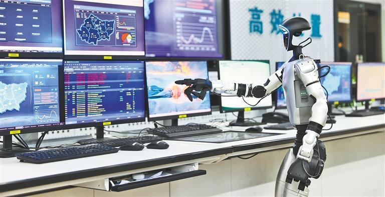 位于湖北省襄陽市的國網(wǎng)襄陽供電公司江北集控站監(jiān)控大廳內(nèi),人形機(jī)器人專注“盯屏”。它能自動生成故障處置建議,遇到緊急情況還能自主撥打通知電話,讓事故分析從15分鐘縮短到秒級,故障處置準(zhǔn)確率提升70%以上。王虎攝(中經(jīng)視覺)