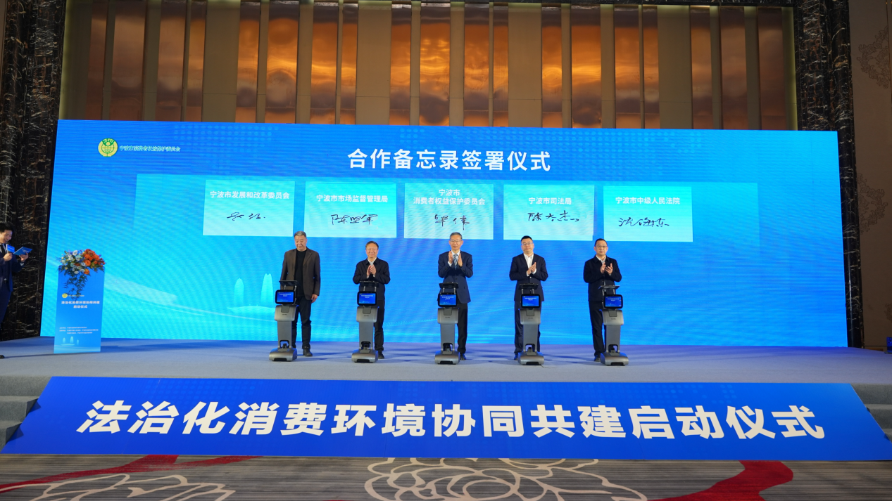 儀式上,寧波市消保委、市中級人民法院、市發(fā)展和改革委員會、市司法局、市市場監(jiān)督管理局五部門共同簽署《關(guān)于構(gòu)建法治化消費環(huán)境協(xié)同保護(hù)機(jī)制合作備忘錄》,該協(xié)同機(jī)制正式建立。