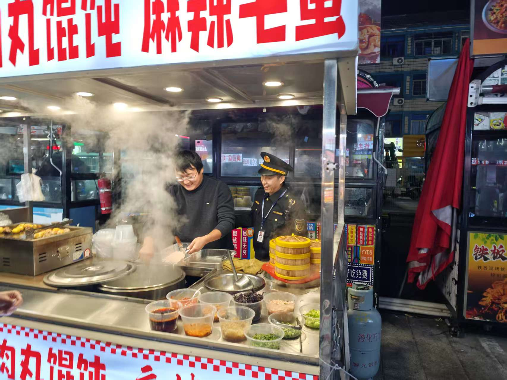 執(zhí)法隊(duì)創(chuàng)新推行“四定一退”管理機(jī)制:定區(qū)域:每個(gè)攤位界限清晰,不越線、不擴(kuò)面;定時(shí)間:統(tǒng)一經(jīng)營(yíng)時(shí)段(晚6時(shí)至11時(shí)),不擾民、不超時(shí);定攤主:實(shí)名登記、人攤對(duì)應(yīng),責(zé)任到人;定標(biāo)準(zhǔn):衛(wèi)生、安全、環(huán)保全面規(guī)范,樹立經(jīng)營(yíng)標(biāo)桿;退出機(jī)制:對(duì)屢次違規(guī)、整改不力的攤主實(shí)行有序退出,保持整體品質(zhì)。通過公開報(bào)名、公平抽簽,15戶符合條件的攤主在此“安家”。執(zhí)法人員化身“夜間管家”,以“綜合查一次”實(shí)現(xiàn)動(dòng)態(tài)服務(wù)與監(jiān)管;攤主簽訂自律承諾,第三方協(xié)同維護(hù),形成共治共享的良好生態(tài)。如今的夜市,道路通暢、油煙規(guī)范,成為職工下班后的暖胃去處,更讓攤主們從“提心吊膽”走向“心安理得”。