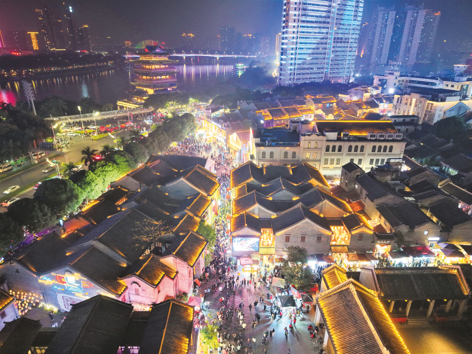 在邕州古城·三街兩巷歷史文化街區(qū)的青磚黛瓦間,文創(chuàng)市集與非遺工坊相互呼應(yīng);漓江書(shū)院內(nèi),游客在精心挑選國(guó)潮伴手禮;百年老店新華照相館仍在為人們定格時(shí)光;傳統(tǒng)小吃攤鋪前聚集著絡(luò)繹不絕的市民游客;“邕城印記”的老友粉制作、麼乜手工藝等互動(dòng)項(xiàng)目吸引大量游客前來(lái)體驗(yàn);國(guó)風(fēng)主題節(jié)會(huì)、夜間巡游、街頭演藝等演藝品牌豐富了文旅沉浸式消費(fèi)體驗(yàn),夜間經(jīng)濟(jì)點(diǎn)亮邕江之濱。該街區(qū)成功入選首批國(guó)家級(jí)夜間文化和旅游消費(fèi)集聚區(qū)、首批國(guó)家級(jí)旅游休閑街區(qū),越來(lái)越多的外地游客慕名到此,感受邕城文化的魅力。